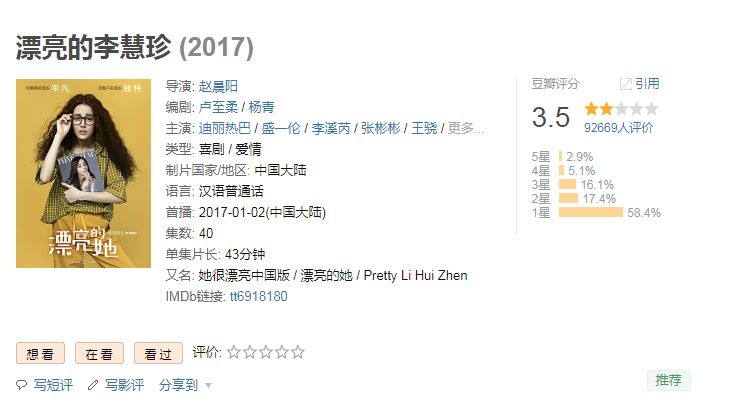 《漂亮的李慧珍》平均收视0.9、豆瓣评分一路从4.6跌到现在3.5。