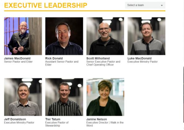 目前,在教会的网站上,点击执行委员会的链接将不再反应出任何内容。但网络缓存页面却列出了教会执行委员会的七人名单,最近更新日为2018年3月。这七人分别是:詹姆斯·麦克唐纳;助理高级牧师兼长老里克·唐纳德;高级执行牧师兼首席运营官斯科特·米尔赫兰德(Scott Milholland);执行传教牧师路克·麦克唐纳(Luke MacDonald);执行传教牧师杰夫·唐纳森(Jeff Donaldson);服侍部执行牧师特瑞·塔顿(Trei Tatum);“将话语化作行动”(Walk in the Word)节目的执行负责人简尼·尼尔森(Janine Nelson)。