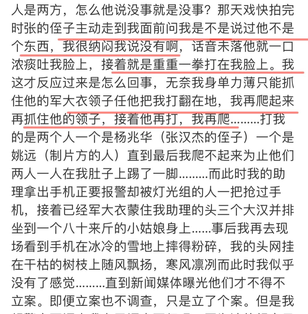 她否认了,但剧组副导演没听,直接给了她一拳,同时还有另一个人也上来打她,将她踢翻在地,甚至对着她的肚子就给了一脚。