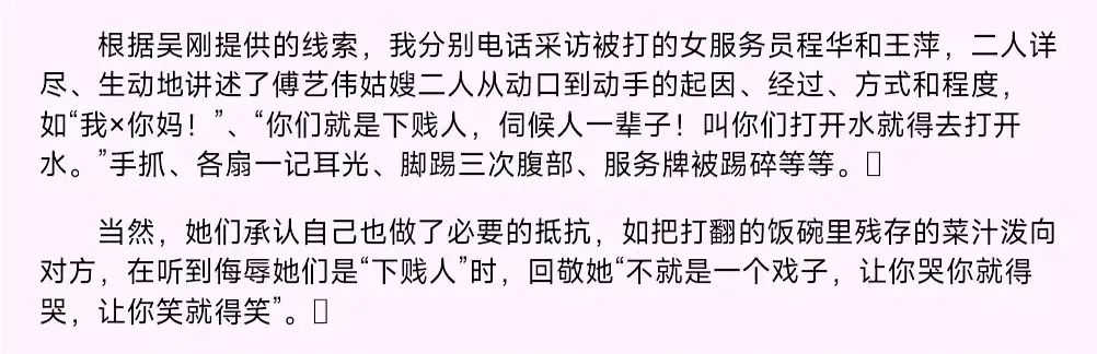 生气的傅艺伟联合自己的小姑子,一起打了对方。服务员在接受记者采访时,详细讲述了自己的被打过程——“手抓、各扇一记耳光,脚踏三次腹部。“