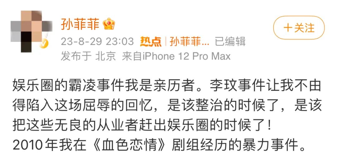 昨天演员孙菲菲发微博爆料,自己之前曾在《血色恋情》的剧组遭遇了霸凌。
