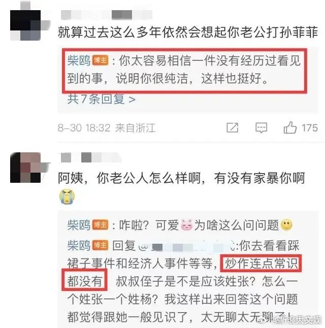 事件里的另一个打人者杨兆华,孙菲菲说是张汉杰的侄子。对于她这个爆料,张汉杰的妻子柴鸥还发微博内涵,说孙菲菲是“没有常识的炒作“。