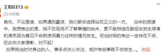 王阳也很快出来解释。表示他当时的表达存在不妥,向大家道歉。并自责如果当时对身边的人和事多点关注,或者有些事就不会发生。