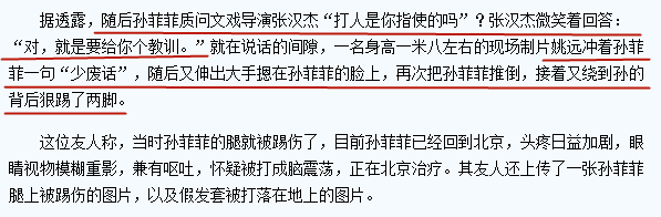 按孙菲菲的说法,这场暴力的起因,是剧组副导演听说她骂了他一句“不是东西”,于是来问她有没有这事。