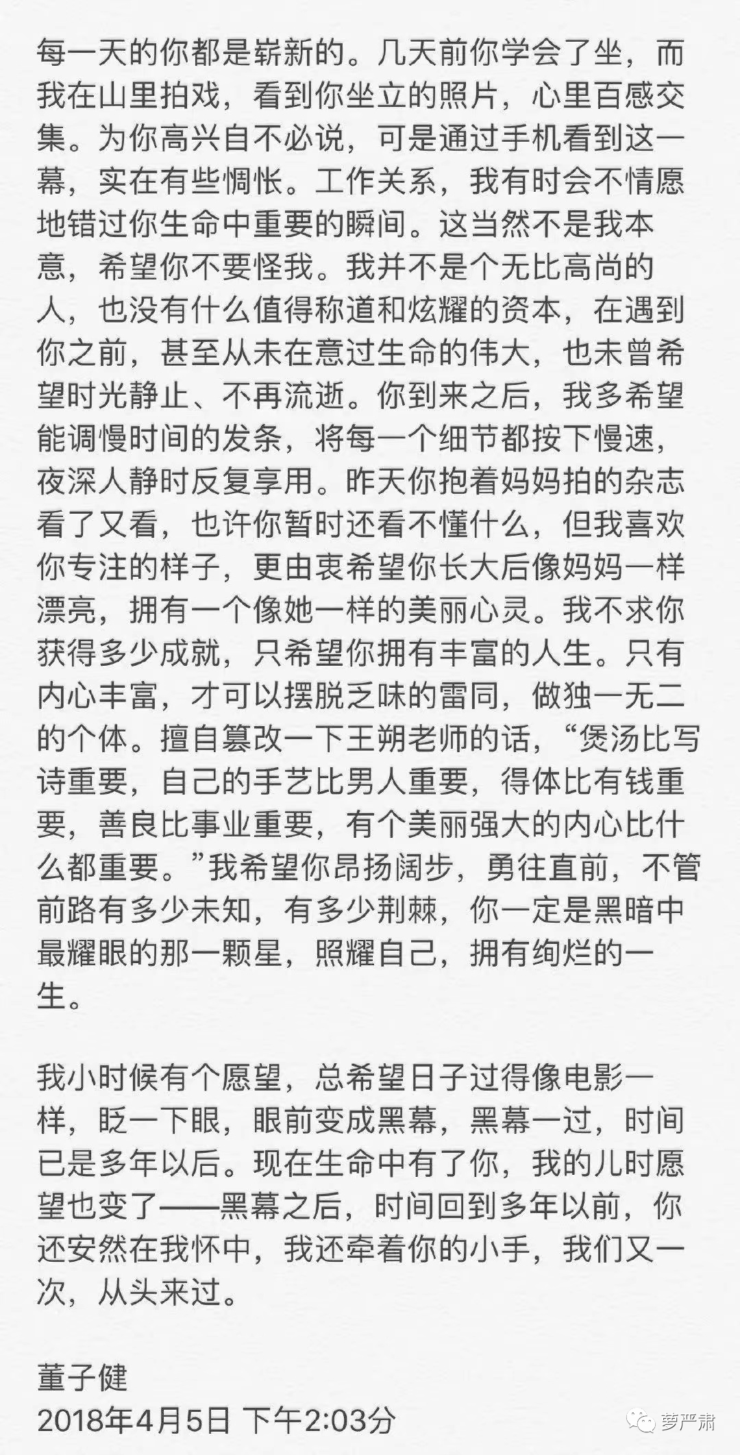 对于很多普通人来说,结婚生子不只是情感选择,也是一个经济问题,需要准备好一定的物质基础,需要想好孩子生下来谁带。但董子健显然是没有这些烦恼。——这有点像,你身边那些家底厚、父母强势的朋友们,总是很容易结婚生孩子。
