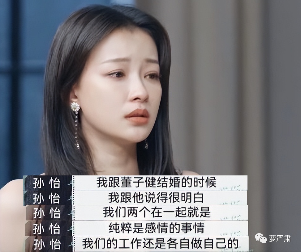 孙怡说自己跟董子健结婚后就要被怀疑靠婆婆,可工作都是自己经纪人去谈的。(其实这个能看出来,孙怡的资源没有什么跟王京花相关的。)