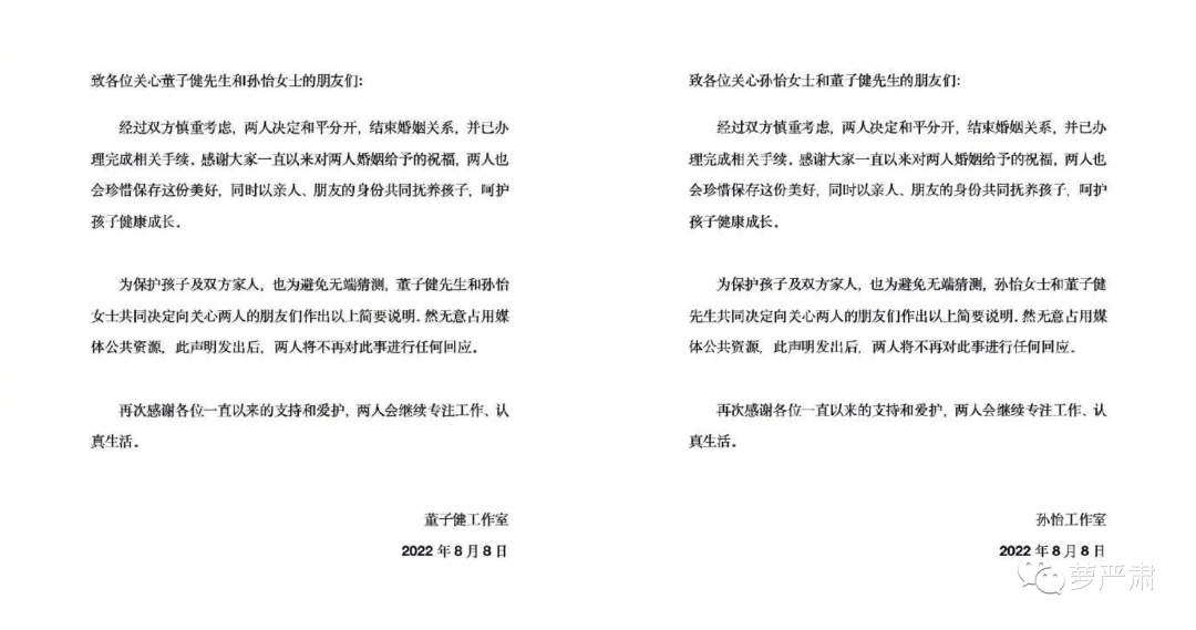离婚声明也是完全一样的文案共享,看起来是好聚好散。