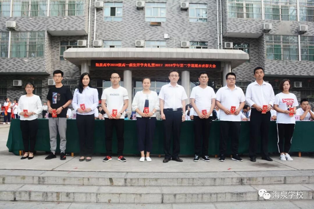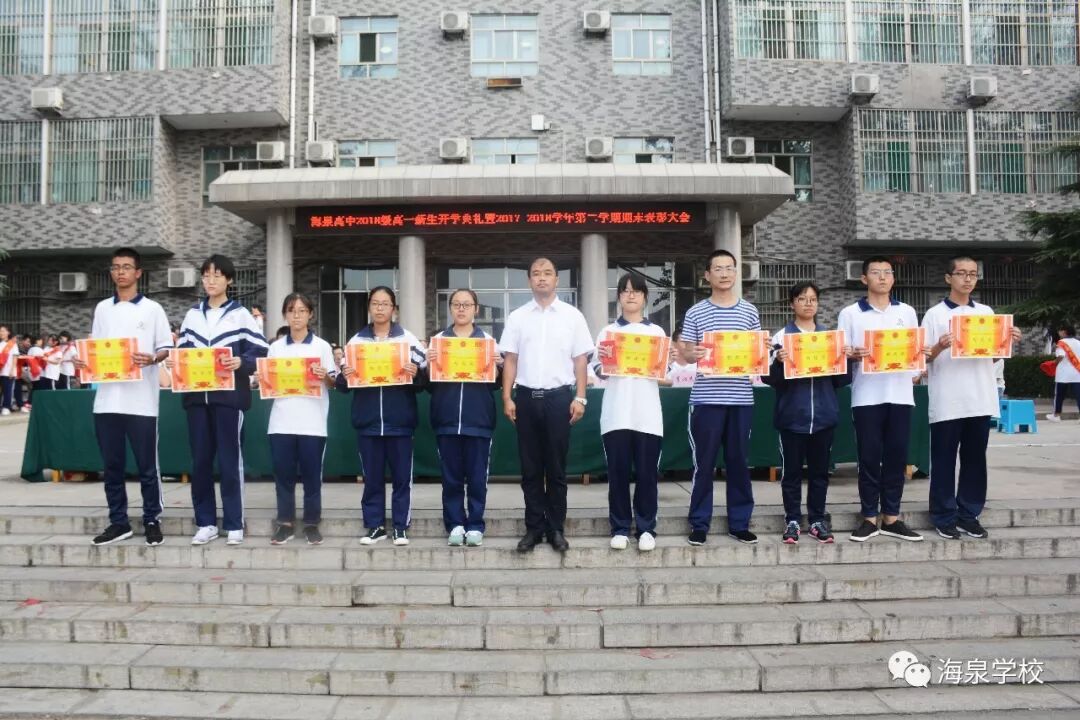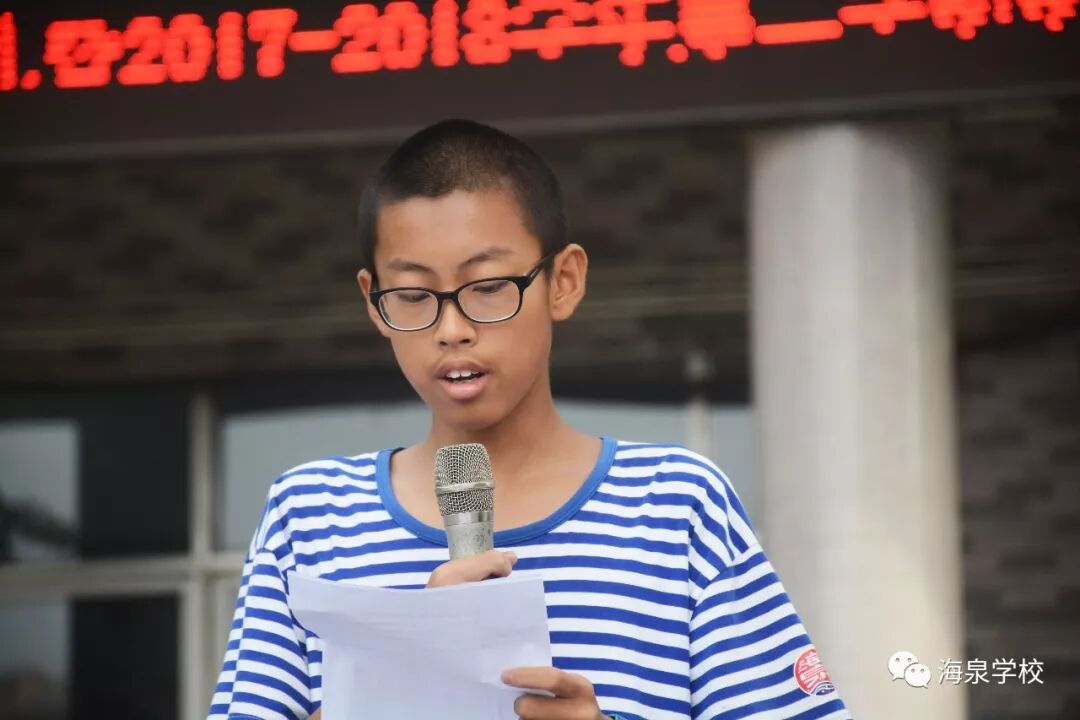 秋风送爽,硕果飘香。他首先代表学校向新加盟海泉学校的教师及全体新同学表示最热烈的欢迎!向一年来为我校发展做出卓越贡献的全体教职工表示崇高的敬意!向今天受到表彰的优秀教师和优秀学生表示热烈的祝贺!在“追求卓越、只争第一”的办学理念引领下,他向在座的全体师生提出三点希望:希望大家要有梦想,要有一个合适的目标;希望同学们养成良好的学习习惯和生活习惯,充分利用好自由支配时间和活动时间,养成科学的作息时间;希望全体教师要有远大的理想,宽广的胸襟,高尚的情操,教会孩子做人,做一个好人。