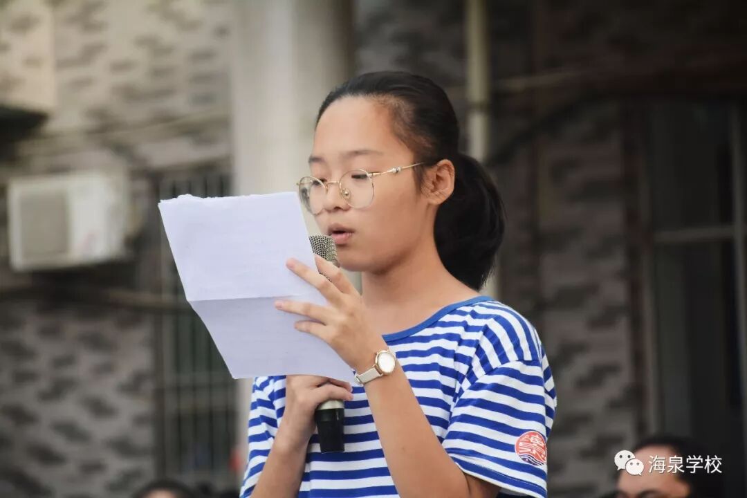 大浪淘沙,方显真金本色;暴雨冲过,更见青松巍峨!海泉是莘莘学子梦寐以求的学习殿堂,是实现梦想大学的摇篮。他说很荣幸代表高一新生在这里发言,他代表高一年级全体新生向辛勤付出的全体教师表示深深的敬意,向高年级的学长们表示亲切的问候。在刚刚结束的军训中,他们练就了军人般铁的纪律和顽强意志,在接下来的学习生活中,乘风破浪,伫立于青春的舞台上,挥洒热情,坚定步伐,咬紧牙关,在竞争之潮中迎风扬帆。