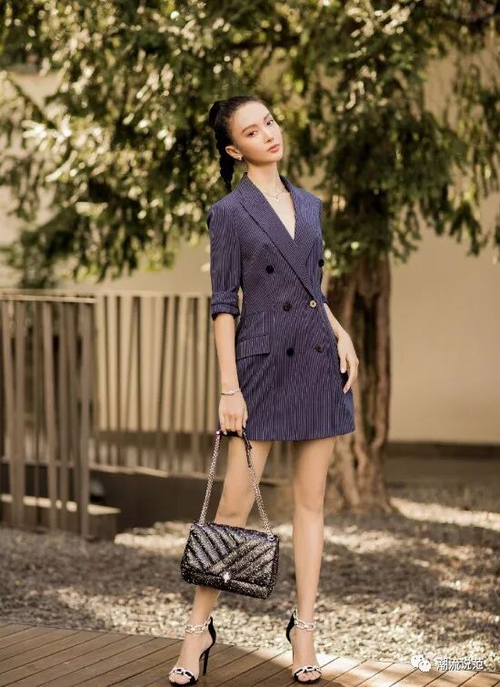 金晨的身材是属于很高挑的那一类的,长相也是比较艳丽和甜美。也因此金晨也是接到了不少的广告代言,毕竟形象确实是很不错。照片中的金晨,一身西装套装,胸前交叉v领的设计,看起来更是性感和知性,短裙的设计,露出了本来就修长笔直的双腿,脚下是一双黑色的高跟凉鞋,头发高扎起来,显露精致的五官,显得精神和帅气。这样的金晨看上去,更加有女人味了,也多了一丝攻气。