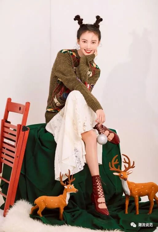 这一身圣诞的装扮也是非常好看,头发高扎成可爱俏皮的两小揪,额前留一些细细的碎发。圣诞主题的毛衣加上一件白色的裙子,脚下是一双红色的绑带高跟鞋,俏皮又性感。甜美的笑容,精致的妆容,看上去就真的是一个从天而降的圣诞小姐姐了。这样的金晨给人一种非常亲和,邻家的感觉,非常青春活力!