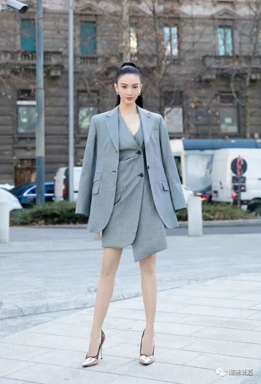 再看看这一身,和上面那一身有异曲同工之妙,依旧是高扎的马尾,也是西装系列,不过这一身看上去更加时尚大方了,灰色的西装裙子,扣子不规则的扣法,个性十足。外面再加一件西装,随意披着,看起来很霸气帅气。有大姐大的气场。本来就很高挑的身材,此时看上去更加修长高挑,更像是一个名副其实的国际名模了,真是时尚的宠儿。