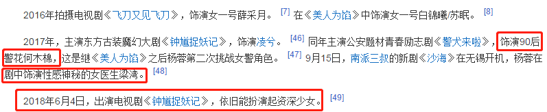 “没戏拍”的意思也不是真正的没有戏演,看看杨蓉的履历,一直没有停止拍戏的脚步。