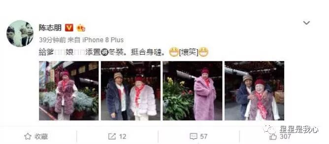 最近的陈志朋晒出了一张照片,照片上面应该他的父母,我们看到他写的是给父母添置冬装,现在的陈志朋已经不是那么年轻了,他们爸妈开上去年纪也不是小了,不过看他买的冬装大家都说看起来很浮夸,倒是像他自己穿的那一种风格。不过他的父母穿在身上显得很高兴,可能只要是儿子买的他们穿上都是会开心的,还在镜头下面摆了几个姿势让儿子拍照,可能是想留下这个开心的时刻。