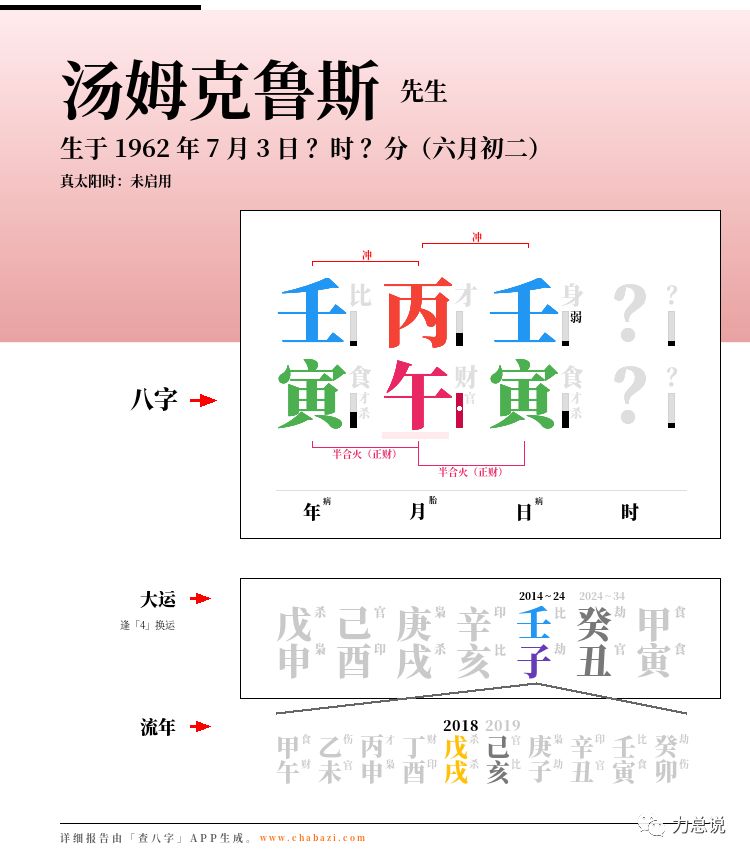 当前的这一运「壬子」,结合他的八字,是三「壬」冲一「丙」,地支又有「子午冲」。也许,如何解决宗教与家庭之间的矛盾,才是汤姆克鲁斯在这一步冲提大运下,必然会遭遇的最艰难课题……