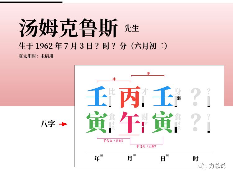 汤姆克鲁斯的八字,比较特别。月柱「丙午」主导「偏财格」,年柱、日柱竟都是「壬寅」,形成左右对称性分布,呈现伏吟之姿(记住这个细节,后面会讲到)。地支「寅」、「午」半合火局,催旺财星「午」亦是他的文昌、将星,人很聪明,魄力十足。