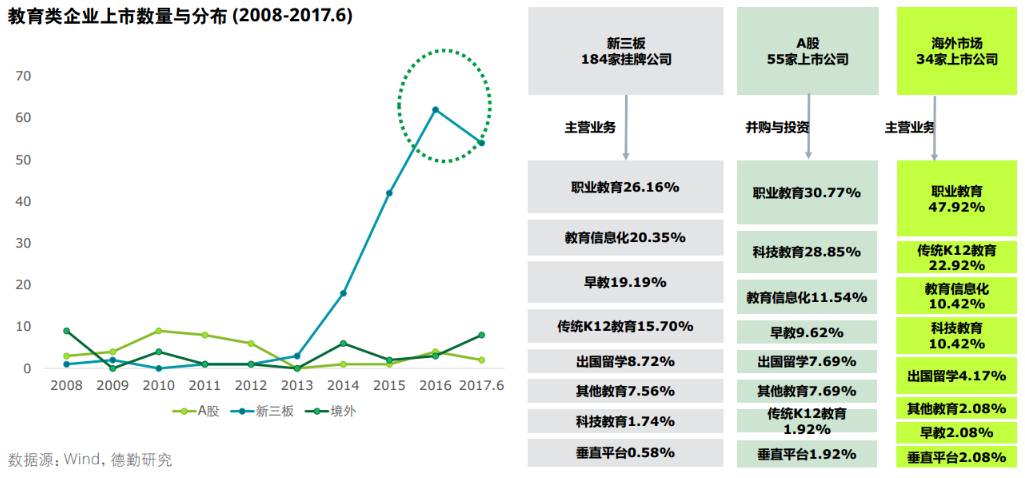 以下是关于教育类公司上市的情况。最上面那条线是新三板公司。除这些公司外,在A股以及海外市场上市的公司数量也不少,美股最近就有三家跟教育相关的公司上市,当然有一点让市场意外的是,这些公司上市以后的表现并不是很好,比起国内大家看到的几乎所有教育行业的投资估值非常高,但是当这些企业真正走到海外资本市场,表现反而和之前有很大差别,这对目前在国内市场这些公司的融资会造成一定的压力,这些机构在海外资本市场上本身受到一定压制,但是A股市场依然是非常好的出口。