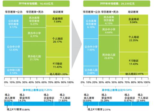 根据德勤2017年教育行业报告,2015年中国教育产业市场的规模大约是1.6万亿,预计2020年市场会达到2.9万亿。从结构上说,这个市场可以分为学历教育-公办、学历教育-民办、培训三类。这个结构本身也在发生比较大的变化,2015年的结构当中,公办教育的比重相对比较高,接近30%,但是预估到2020年这个数字会和平下降到20%多一点,而民办教育会有相对比较大的增长,同时最大的增长体现在教育培训方面。