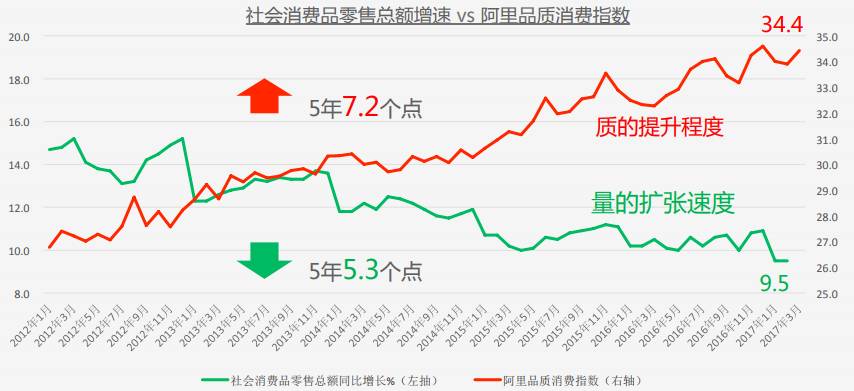 上面这张图是一张对比图,绿线是社会消费型零售总额的增速,红线是阿里消费指数,红线远远高于绿线,这可以从一定程度上说明,目前的消费者对于消费品质的需求越来越高。
