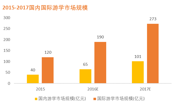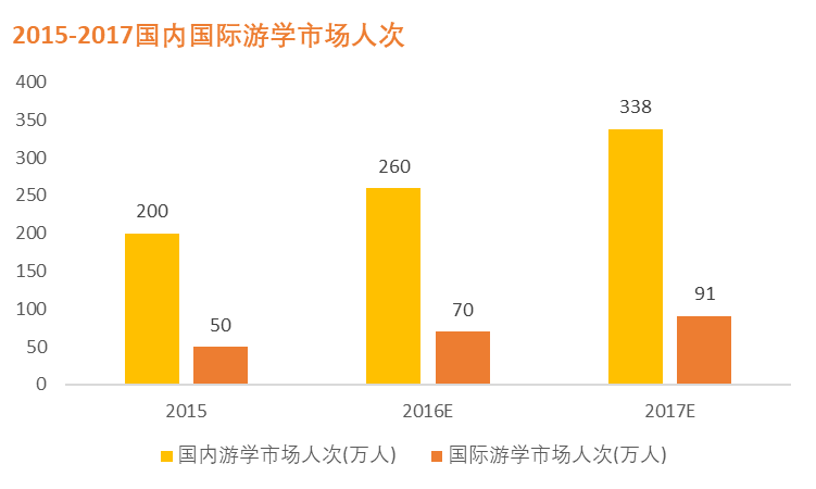 下图是2015年至2017年国内、国际游学市场的规模。大家可以看到,近两年,国内、国际游学市场规模越来越大。2017年,全年国际游学市场规模预计有273亿左右。从这个角度而言,教育衍生出来的服务型消费上升速度越来越快。