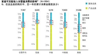这是罗兰贝格的问卷调查结果,表明家庭中可支配收入对教育的影响。根据这份调查结果,高端人群在婴童教育部分的消费已经占收入的20%。母婴行业的发展也预示着未来在新的二胎化政策情况下,教育相关的行业会发展迅速,其中包括早教、K12教育等。