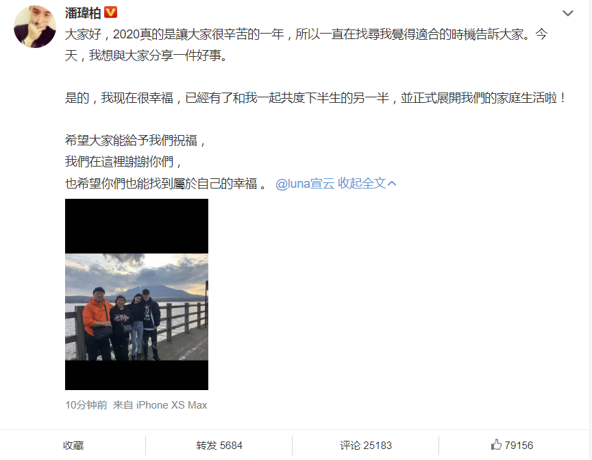 整个事情的起因是,前天潘玮柏在微博上官宣了自己的婚讯,和一名叫做宣云的女孩结婚了: