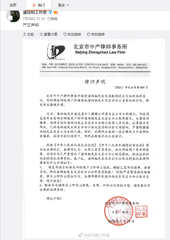 昨天,潘玮柏工作室发表了声明,就最近一些网友的无端猜忌和侮辱,决定用正确的方式维护自己的权益和声誉。