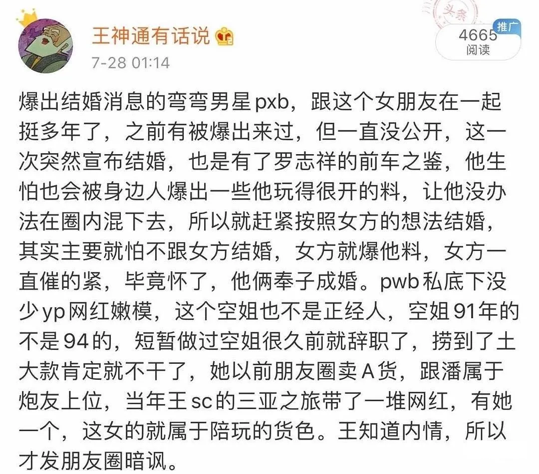 更有人爆料潘玮柏官宣结婚是因为受到罗志祥的前车之鉴,女方怀孕又逼得紧,害怕她会跟周扬青一样把手里那些他玩的很开的料都给说出来,所以就顺着女方给她个名分。