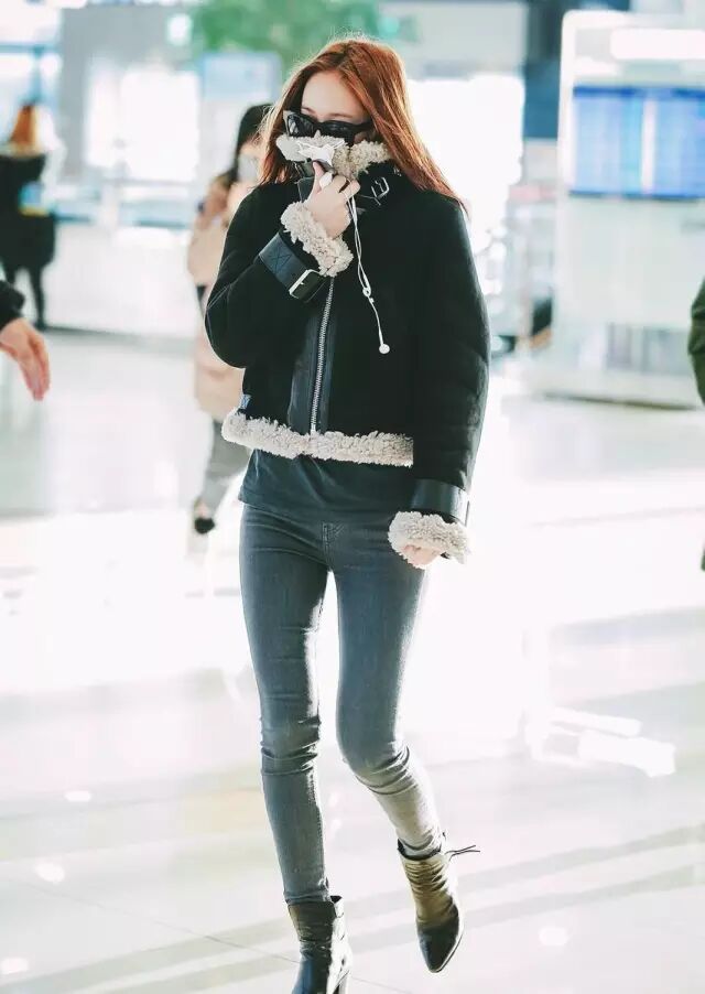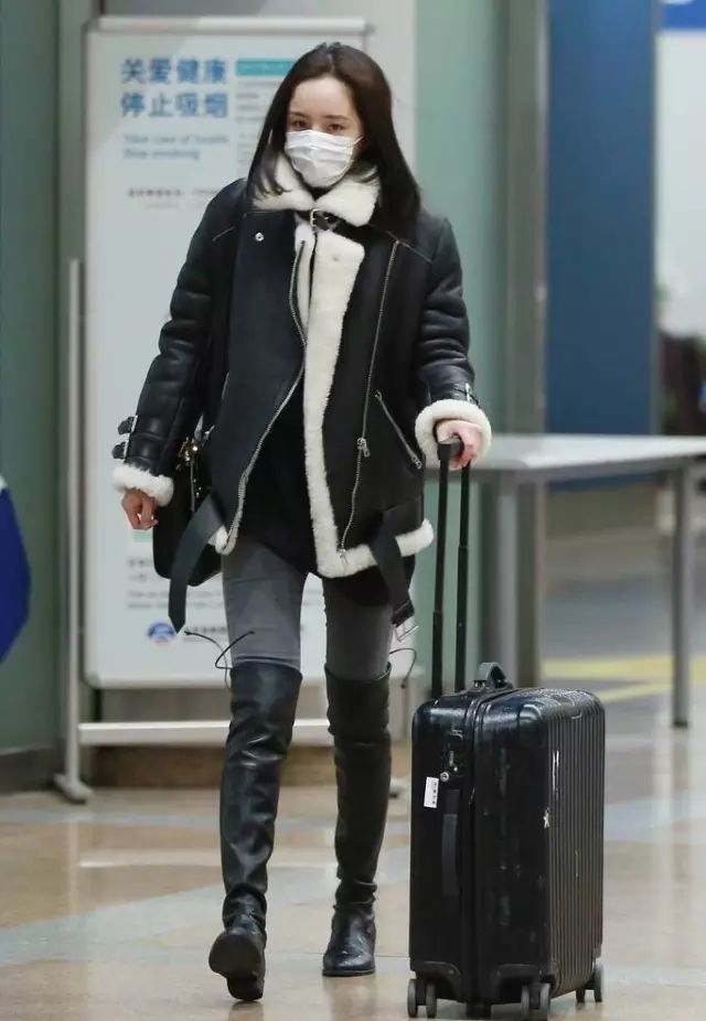 杨幂这个爆款小公主在今年2月份的时候就已经穿过皮质的羊羔毛外套,深灰色牛仔裤&过膝靴在她身上已经接近平庸,但是穿在咱们身上可能就灾难了!