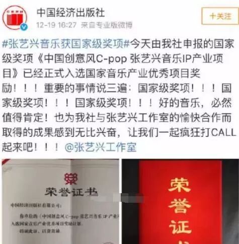 但是现在,粉丝终于可以扬眉吐气一次了,因为张艺兴被央媒表扬了,《中国创意风C-pop 张艺兴音乐IP产业项目》已经正式入选国家音乐产业优秀项目奖励!要知道,这可是国家级别的奖项啊,张艺兴似乎是90后的第一人吧!而且这不是什么野鸡奖项,而是正儿八经国家颁布的。