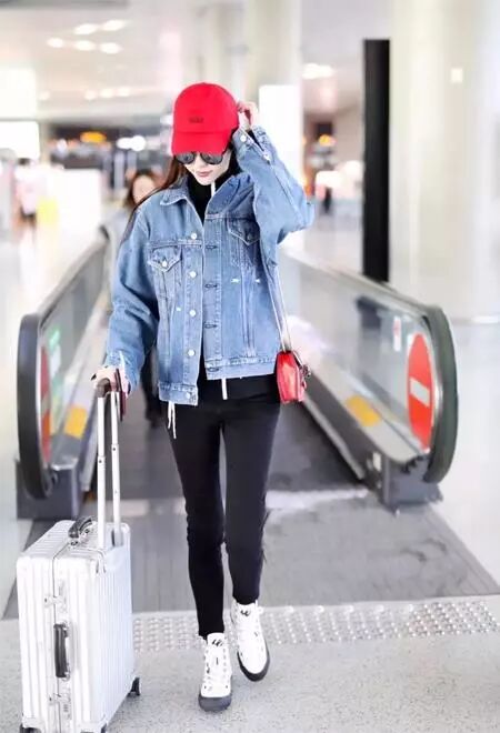 唐嫣将一件半高领的“校服款”拉链卫衣套在牛仔外套里面,下搭黑色紧身裤,头戴一顶红色棒球帽。整体非常活泼青春。即使在寒冷沉闷的冬季,这样的配色也让人眼前一亮。
