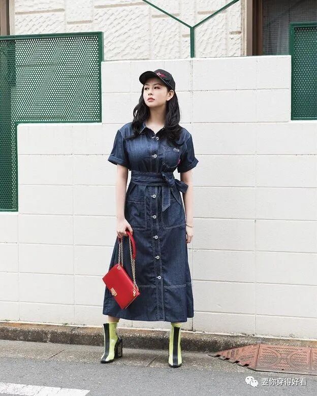 沈月这件连身牛仔裙的腰带细节突显腰线,令下半身看起来更修长;拼色的短靴和红色链袋也为造型添上亮点。