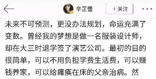 与那些从小立志当明星的人不一样,那时候表演这件事情跟出身清贫的辛芷蕾没有半毛钱关系。辛芷蕾小时候表现出了不俗的美术天分,她也非常努力地考上了理想的服装设计学院,梦想当一名服装设计师。但还未毕业一场横祸让她的爸爸瘫痪了。妈妈需要照顾爸爸,没办法再做全职工作,而弟弟妹妹都还要上学,辛芷蕾只好边上学边打工。