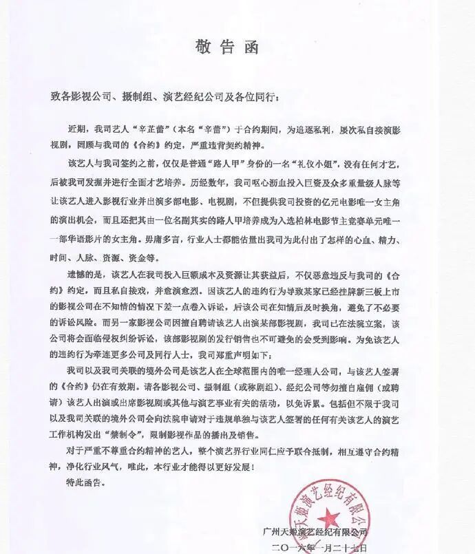 就连原经纪公司也因为她“太想红”私自接戏发出警告函,这封函件陈述的内容很多,大有将她全面封杀之势。