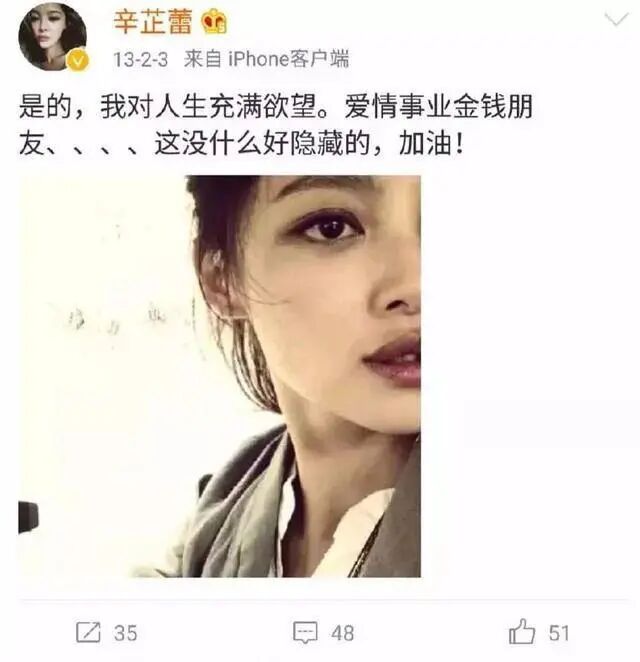 很多人喜欢把内心想要的东西隐藏起来,但辛芷蕾偏不,早在2013年她就在微博上坦承自己对人生充满欲望,爱情、事业、金钱、朋友……