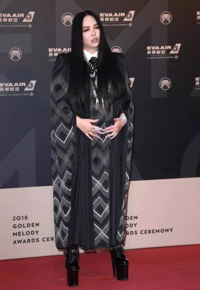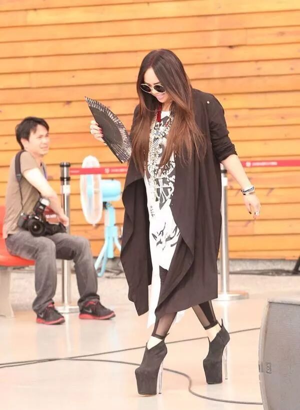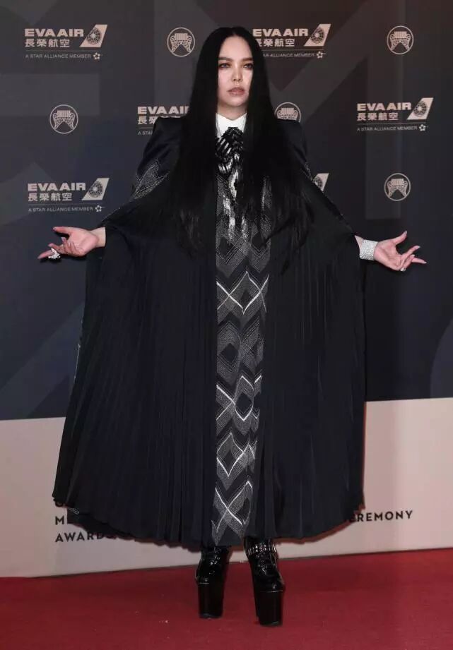 张惠妹的时尚真是看不懂呢,这一身黑色的披风再加上这浓浓的妆容,真像是过万圣节呢!而且脚上这双超厚底的鞋子,也是太土鳖了。