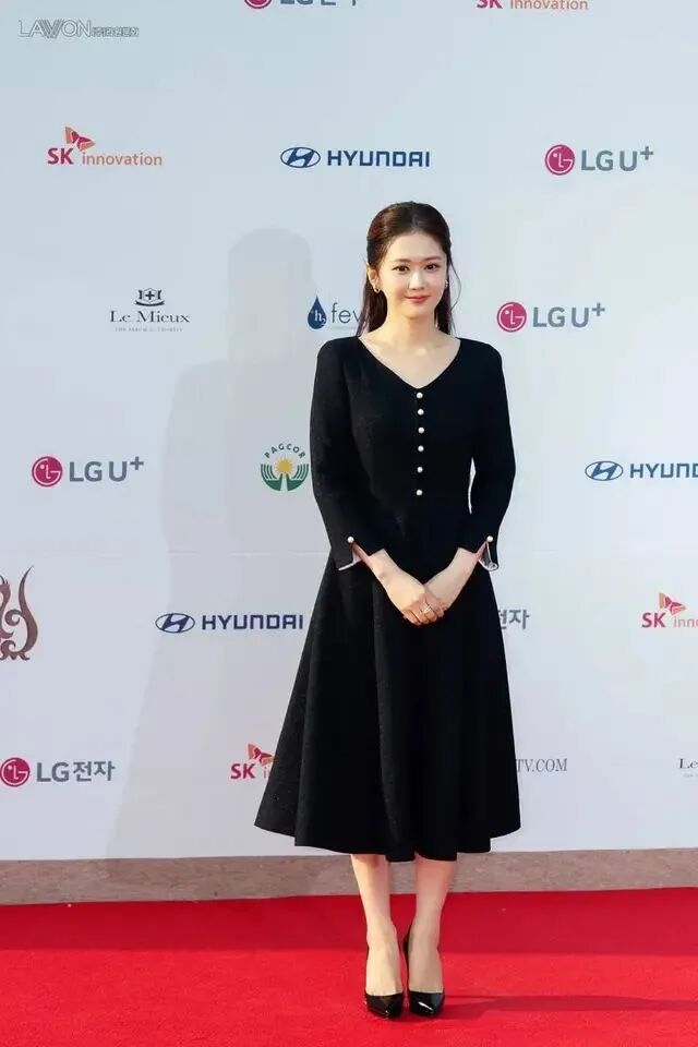 张娜拉的头发比较长,而且颜色还是黑色,没有进行染发烫发,整张脸看起来比较娇小,身上穿的这条晚礼服裙的颜色看起来比较素雅,不过在袖子那里采用的是蕾丝的设计,而且这条裙子的长度实在是太长了一些,直接拖在地上了。
