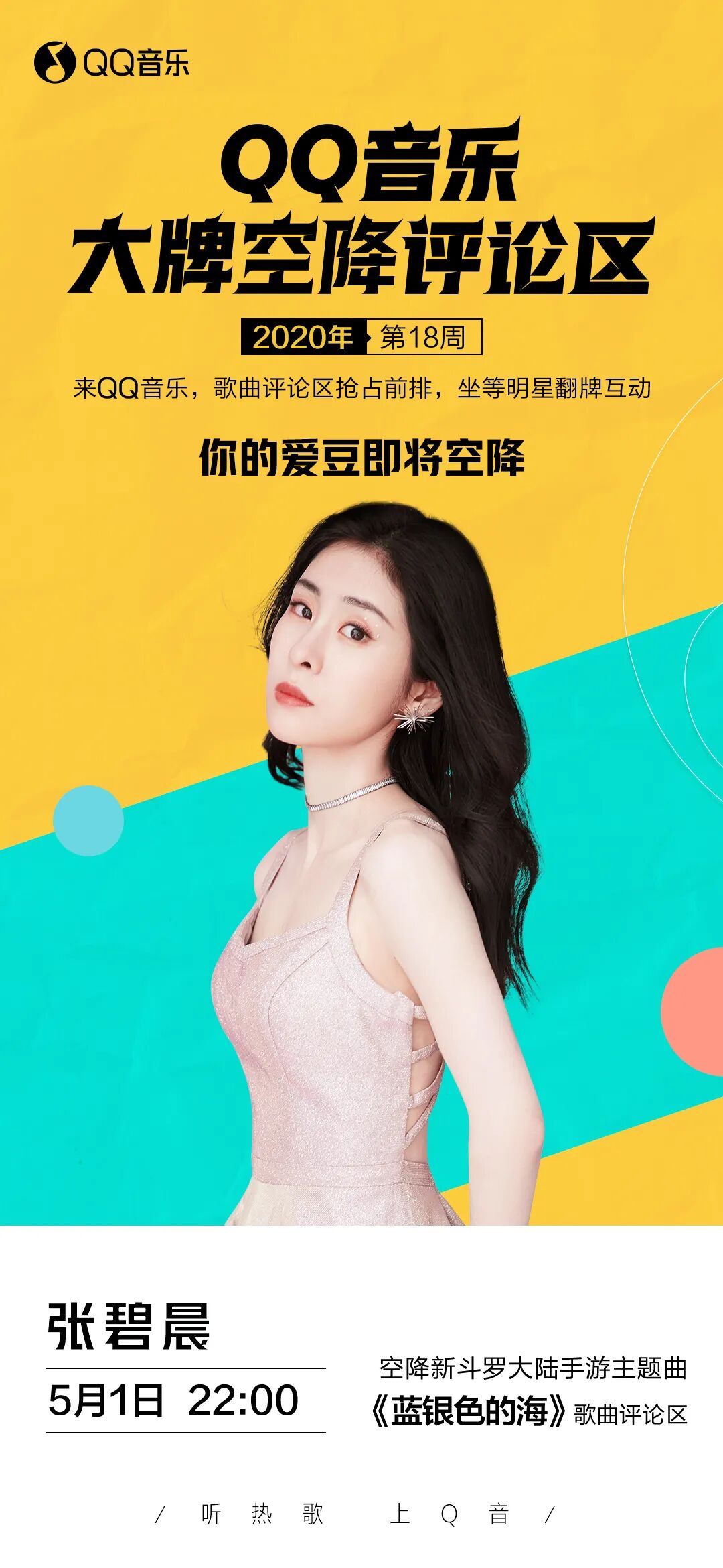 第一个重点,就在5月1日今晚10点钟,张碧晨将空降QQ音乐评论区,想被她翻牌子吗?还等什么,定好闹钟,把想说的话在QQ音乐《蓝银色的海》评论区大声说出来!