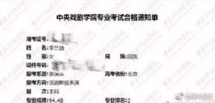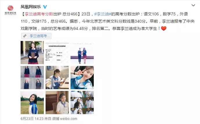 而此前取得中戏艺考女生专业第一名佳绩的李兰迪,她的高考文化课成绩昨天也被曝光了,总分为466分,超过北京艺考分数线126分~