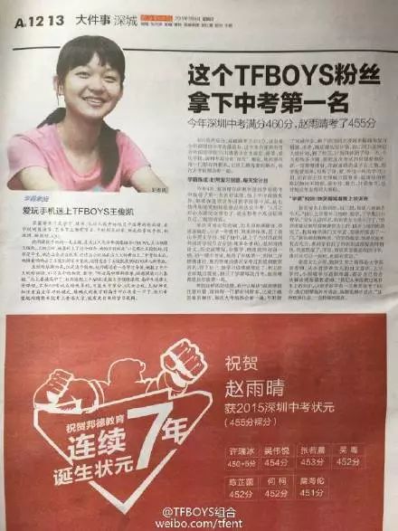 还有一位粉丝三年前是深圳市中考状元,今年高考又被直接保送清华,作为小螃蟹,看到偶像小凯这么优秀,这位小姑娘就给自己设下了目标:一定要比小凯好,这应该就是偶像的正能量行为吧~