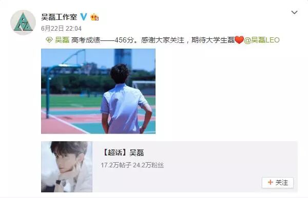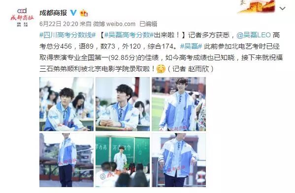 这几天各省的高考成绩陆续公布,瓜众们最好奇的明星考生们的文化课成绩也一一出炉,此前北电艺考中获得表演专业全国第一名的吴磊是明星考生中高考成绩最早公布的,22号那天工作室就发微博告知大家三石弟弟的高考成绩:456分
