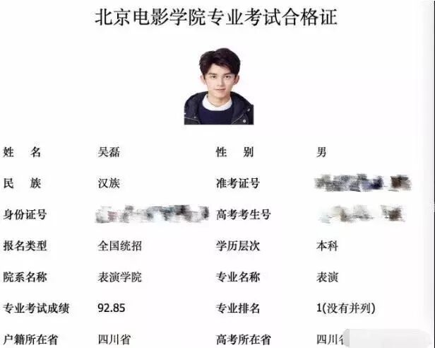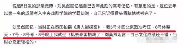 同年高考的刘昊然,高考454分,超过了艺考线100多分,而且昊然弟弟当年考试前几乎没有闭关时间,7号考试,5号才回北京拿准考证,6号休息一天,第二天就去考试了,在此之前他一直在剧组拍《唐人街探案》