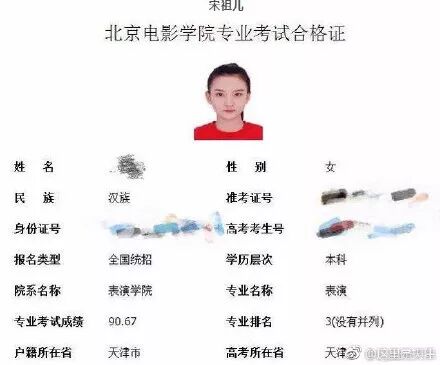 同样在北电艺考中取得全国第三名优异成绩的天津考生宋祖儿,高考成绩也相当不错,总分为454分,不仅超过了天津市艺术类本科录取分数线171分,还超过了天津普本文史类分数线(分数线为436分),掌声鼓励~~