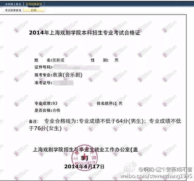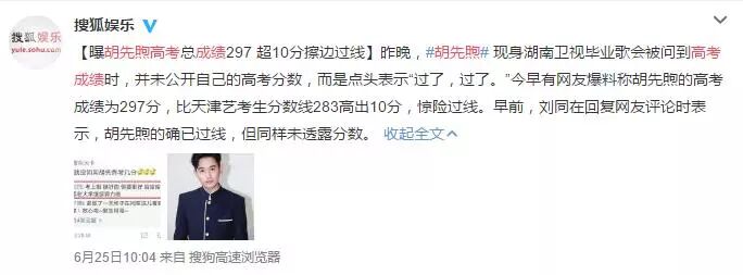 另外一位天津考生胡先煦也在前晚的活动现场向媒体透露自己过了艺术类本科录取分数线,后来有网友曝光其总分为297分,刚刚过线~