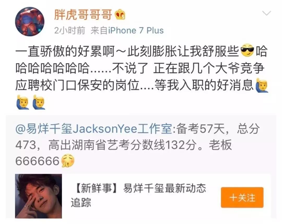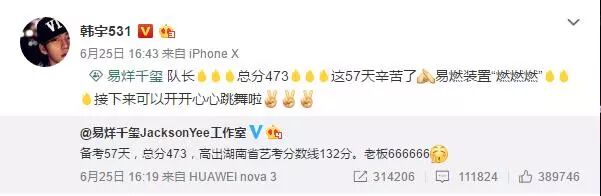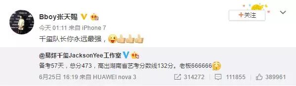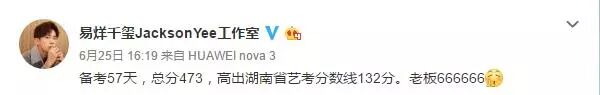 昨天下午易烊千玺工作室发微博公布了千玺的高考总分为473分,超过湖南省艺考分数线132分,此前千玺参加中戏艺考取得了全国第一名的好成绩~