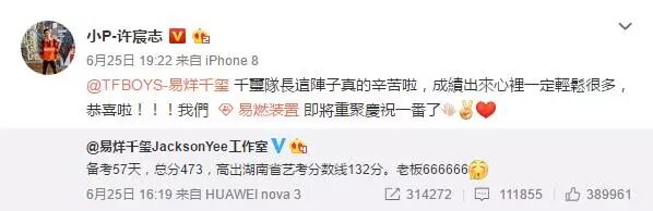 早在千玺工作室公布千玺成绩前,易燃装置战队的钟晨就已经发微博祝贺千玺了,这消息怕不是千玺大佬提前泄密的哈哈~