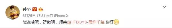 千玺的高考分数公布后,之前一直给千玺洗脑报考中戏的孙坚第一时间就发微博祝贺千玺,“师弟”马上就喊起来了~