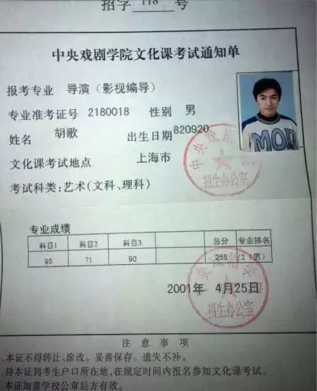 胡歌当年高考也很厉害,不仅艺考专业成绩高分过,而且文化课成绩也不输,满分300,他考了250+分,其中两科都上了90分,有着导演梦的他因为父母不愿意他离家太远,后来他就去试考上戏的表演系,取得全国第三的好成绩