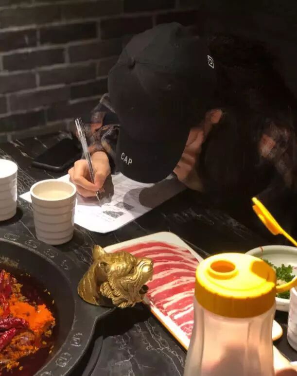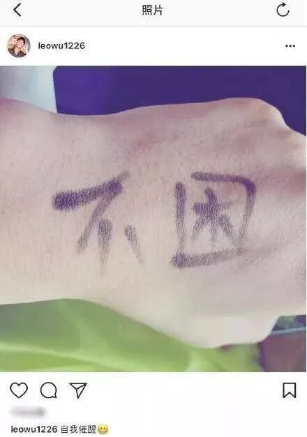 在考前仍有行程的三石弟弟,没有工作的时候一天要上12个小时的课,备考压力过大的三石弟弟为了振奋精神在手上写了“不困”和“加油”