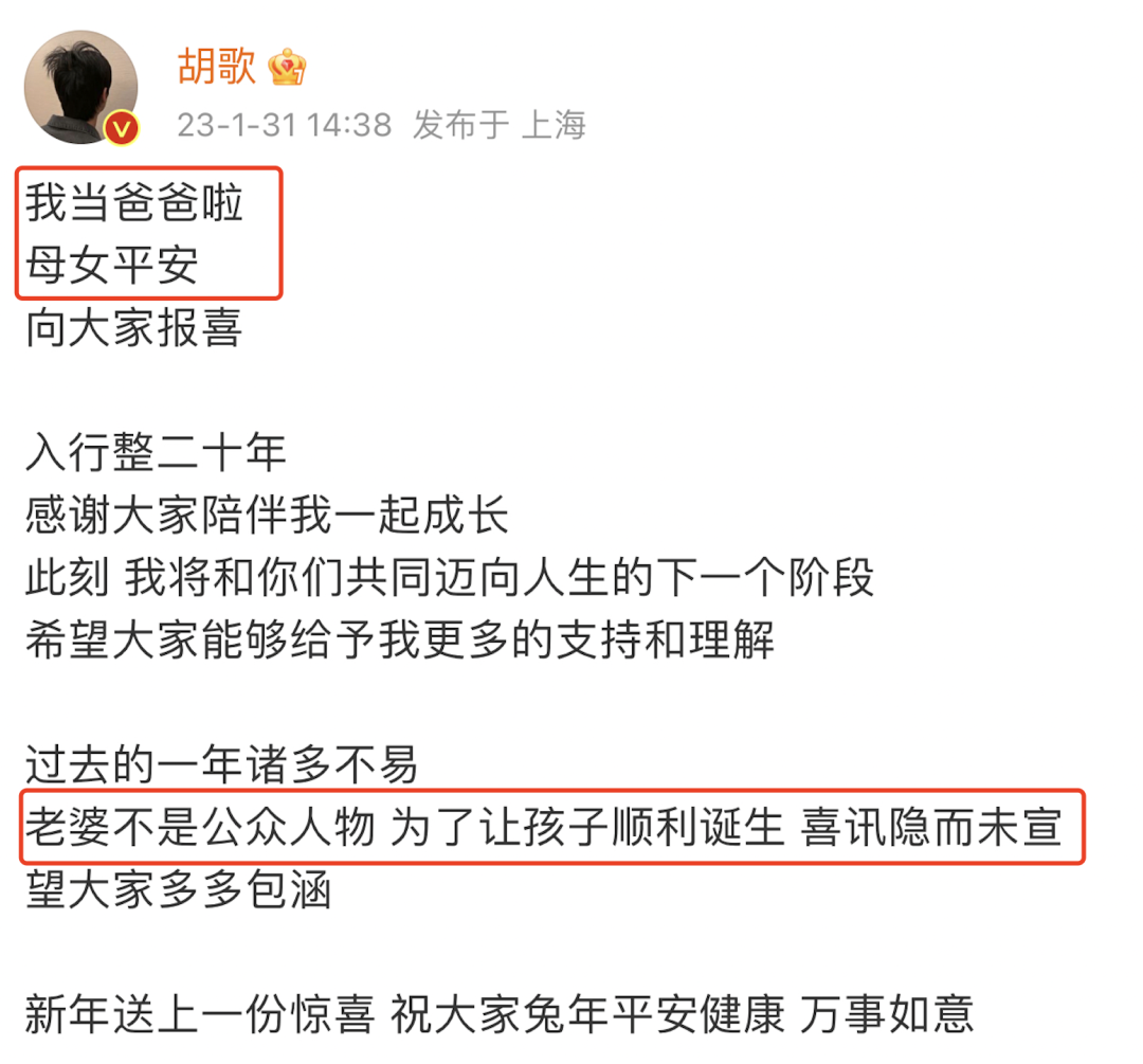 胡歌当爸,老婆是她? 南都娱乐 内地男星 2023-01-31 21:30:42 306 创作不易,用心坚持,欢迎请BaGua喝几杯爱心咖啡!打赏并支持本文 打赏并删除本文 本文原创自微信公众号“南都娱乐”,微信号:nanduent只有彭于晏受伤的世界达成了就在今天,内娱开年第一口大瓜诞生!胡歌突然官宣当爸爸,母女平安,还透露了老婆不是公众人物,为了让孩子顺利诞生,喜讯隐而未宣↓热搜榜单瞬间两连爆,服务器也一度卡顿↓网友们纷纷表示震惊↓毕竟多年来,调侃胡歌单身已经变成了一个深入人心的“国民梗”。当年《仙剑》系列的主要演员们大多都已结婚生娃,而作为男主角的胡歌一直未见动静,被网友笑称为仙剑的“留守儿童”。如今他恋爱、结婚、生娃一步到位,且毫无预警,这大概就是“我要偷偷努力,然后惊艳所有人”吧可是,说好的不会隐婚,领证就发微博呢!↓随后,一起出演《仙剑3》的唐嫣、袁弘也转发胡歌的微博送上祝福,顺带嗑到了仙剑多年不变的神仙友情↓然而,就在一片震惊和恭喜声中,只有彭于晏一人受伤的世界达成了。作为《仙剑》系列的另一位著名“留守儿童”,面对网友的催婚,彭于晏曾经是和胡歌“抱团取暖”的“难兄难弟”。胡歌:我不着急,彭于晏还没结婚呢↓听到胡歌的回应,彭于晏也表示淡定:他不急,那我也不急了↓现在胡歌连女儿都有了,这下压力全部给到了彭于晏这里关于胡歌的老婆到底是谁,是目前吃瓜群众最好奇的事情。现在流传最广的一种说法是,胡歌老婆是他以前的执行经纪人黄曦宁,还曝光了她的疑似正面照,甚至还扒出了两人去年登记结婚的隐私信息......因该说法目前未能得到证实,小编此处只放上用小兔子打码的照片示意↓胡歌出道二十年,通过在《仙剑》系列电视剧中饰演“李逍遥”一角走红,凭借《琅琊榜》《伪装者》等代表作奠定实力派演员的地位。除了事业上的成就,胡歌的感情生活一直备受关注,曾经有过两段公开的圈内恋情。第一位是薛佳凝,她比胡歌大4岁,同为上海戏剧学院的校友。2003年,两人结识于《天下无双》的片场;2006年,正式确认恋爱关系。就在同一年,胡歌遭遇严重车祸,经历4天2次全麻手术的抢救后活了下来,脖子和脸缝了100多针。薛佳凝第一时间赶到医院探望,才让这段姐弟恋逐渐浮出水面。康复期间,胡歌住在薛佳凝家中,并一直由她悉心照料。当时,薛佳凝已经通过《粉红女郎》的“哈妹”一角走红,事业正处于上升期。为了专心照顾胡歌,她不惜推掉了一年的工作,直到2007年胡歌伤愈复出。然而,共患难的情侣未必就能走到最后。2008年,两人选择了和平分手。关于分手的原因,外界众说纷纭。有说性格不合,也有传言是因为胡歌的妈妈不同意。2015年,胡歌因《琅琊榜》《伪装者》再度爆红,昔日的恋情再度被提起。当薛佳凝被问到旧爱时,她应对得体,拒绝消费前男友,堪称前任的典范。后来,胡歌在节目中回首这段恋情,称没有公开感谢过薛佳凝是他“最大的一个遗憾”↓还曾哽咽着感慨道:她是真的很好↓第二位则是江疏影,同样毕业于上海戏剧学院。2014年,两人因拍摄电视剧《旋风十一人》结缘。恋情曝光的过程也是有亿点好笑。先是被拍到在机场互相喂食,举止亲密↓或许因为太过投入美食,被机场广播点名,催促尽快登机,才让恋情彻底曝光(这是什么大型社死现场)↓但不到一年,两人就宣布分手,以至于到了因戏生情的《旋风十一人》播出,两人在合体宣传时刻意保持距离,倍显尴尬↓大概是因为胡歌的婚恋状况成为了吃瓜群众们心中的老大难问题,江湖上隔段时间就要传一次胡歌的恋情,从与旧爱复合,到跟不同对象结婚、生娃,但都被官方一一辟谣↓在一次采访中,胡歌曾说他最看重的一个身份就是父亲,太晚当爸爸不好,因为不想和孩子年龄差距太大,到了孩子最能玩的时候,他玩不动了。如今胡歌正好40岁,终于得偿所愿,组成美满家庭,祝福胡歌!如果你想合作——新媒体商业合作请通过以下方式联系微信号:ZDGYing 创作不易,用心坚持,欢迎请BaGua喝几杯爱心咖啡!打赏并支持本文 打赏并删除本文 感谢您的支持鼓励,我会继续努力的!文章地址:用户邮箱:打赏金额:USDT 请输入数字点击”去打赏“,即可进行打赏支持本文章哦 胡歌 发表评论